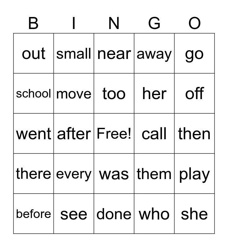 This bingo card has a free space and 40 words: the, went, far, move, see, was, too, change, go, there, after, away, she, then, call, every, and, out, large, near, play, who, her, school, little, good, house, earth, you, by, long, before, with, them, off, done, for, were, small and about.