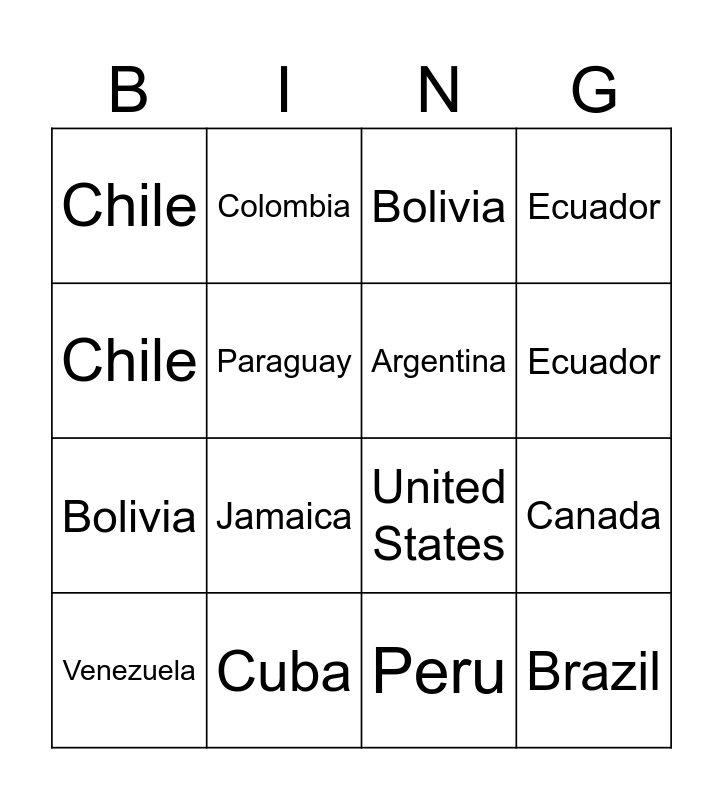 ⚠ This card has duplicate items: United States (2), Canada (2), Mexico (2), Brazil (2), Argentina (2), Chile (2), Peru (2), Colombia (2), Venezuela (2), Ecuador (2), Bolivia (2), Paraguay (2), Uruguay (2), Cuba (2), Jamaica (2), Haiti (2)