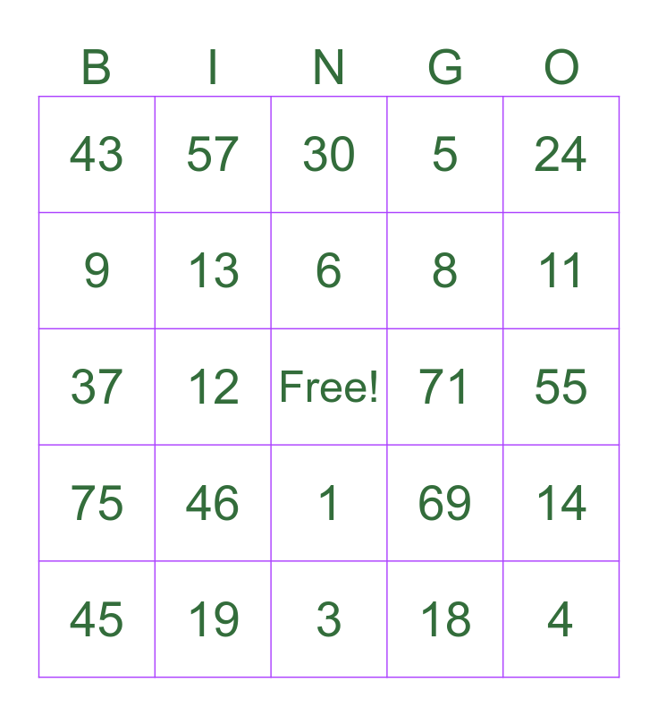 This bingo card has a free space and 34 words: 2, 18, 35, 50, 75, 13, 24, 45, 57, 61, 6, 30, 66, 48, 71, 11, 19, 37, 46, 69, 1, 25, 43, 55, 3, 4, 5, 7, 8, 9, 10, 12, 14 and 15.