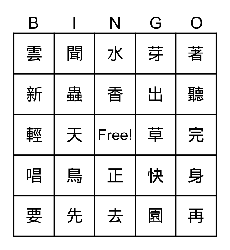 This bingo card has a free space and 29 words: 要, 靜, 天, 空, 雲, 水, 蟲, 鳥, 草, 先, 完, 再, 去, 園, 聽, 沒, 正, 唱, 著, 輕, 快, 歌, 出, 新, 芽, 聞, 身, 香 and 呢.