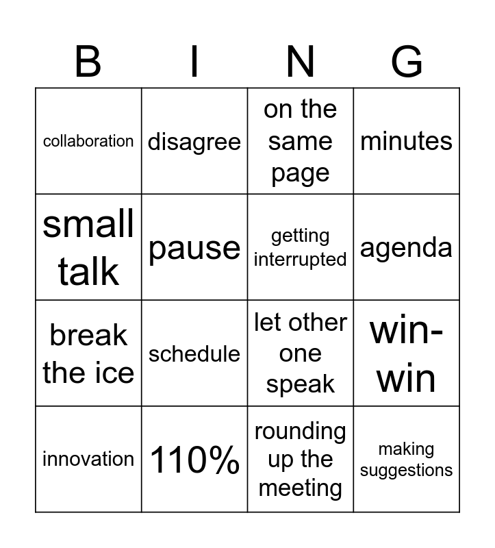 This bingo card has 16 words: 110%, win-win, on the same page, collaboration, break the ice, disagree, let other one speak, rounding up the meeting, small talk, pause, innovation, minutes, schedule, agenda, getting interrupted and making suggestions.