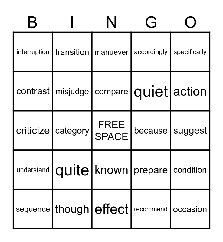This bingo card has a free space and 73 words: consider, dishonest, interruption, inappropriate, valuable, unacceptable, understand, research, prepare, particular, misuse, process, misjudge, suggest, cause, transition, effect, contrast, achievement, because, compare, accordingly, specifically, consequently, sequence, explanation, calendar, beneficial, through, criticize, though, accomplish, humorous, changeable, category, thought, harass, thorough, occasion, amateur, recommend, quite, grateful, peculiar, quit, quiet, manuever, eligible, sincerely, criticize, separate, receive, locate, actually, include, material, hospital, known, national, metal, least, information, interrupt, action, experience, awhile, describe, factor, condition, develop, amount, company and figure.