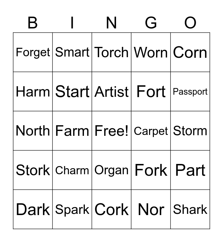 This bingo card has a free space and 24 words: Charm, Spark, Artist, Dark, Corn, Forget, Harm, Smart, Carpet, Organ, Fort, North, Fork, Part, Start, Nor, Storm, Torch, Passport, Farm, Shark, Stork, Worn and Cork.