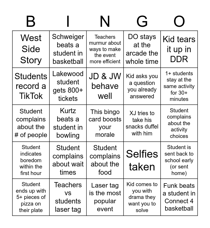 This bingo card has a free space and 24 words: Student complains about wait times, Teachers vs students laser tag, JD & JW behave well, Student ends up with 5+ pieces of pizza on their plate, Kid tears it up in DDR, West Side Story, Students record a TikTok, Schweiger beats a student in basketball, XJ tries to take his snacks duffel with him, Student complains about the food, Kid asks you a question you already answered, Student complains about the # of people, Selfies taken, Student is sent back to school early (or sent home), Lakewood student gets 800+ tickets, Kid comes to you with drama they want you to solve, Student complains about the activity choices, Teachers murmur about ways to make the event more efficient, 1+ students stay at the same activity for 30+ minutes, Kurtz beats a student in bowling, Funk beats a student in Connect 4 basketball, Student indicates boredom within the first hour, DO stays at the arcade the whole time and Laser tag is the most popular event.