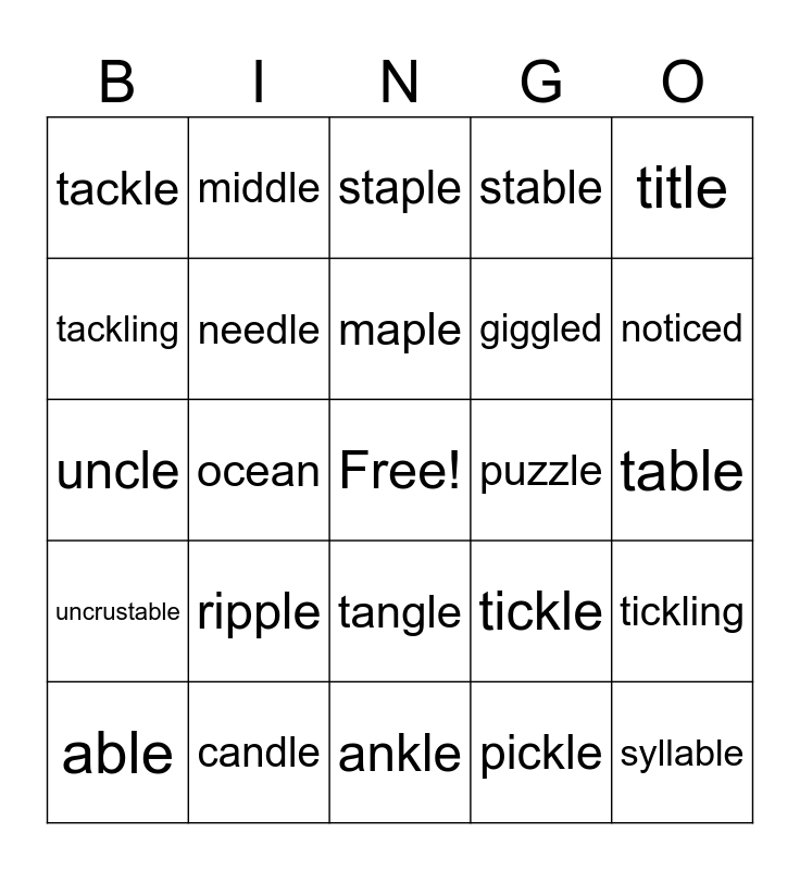 This bingo card has a free space and 24 words: ripple, candle, maple, able, title, tackle, tackling, middle, puzzle, tangle, giggled, uncle, tickle, tickling, needle, pickle, table, staple, noticed, ocean, syllable, uncrustable, stable and ankle.