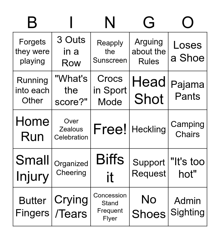 This bingo card has a free space and 24 words: Organized Cheering, Crying /Tears, Crocs in Sport Mode, Butter Fingers, Loses a Shoe, Forgets they were playing, Running into each Other, 3 Outs in a Row, Heckling, Biffs it, Head Shot, Home Run, Support Request, "It's too hot", "What's the score?", No Shoes, Camping Chairs, Reapply the Sunscreen, Pajama Pants, Over Zealous Celebration, Admin Sighting, Small Injury, Arguing about the Rules and Concession Stand Frequent Flyer.