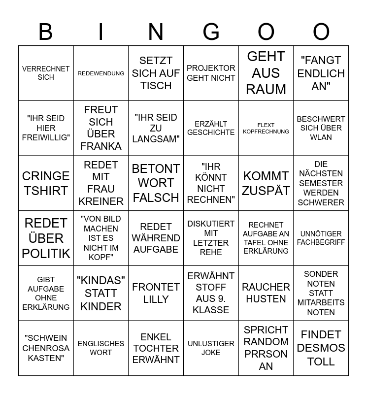 This bingo card has 36 words: ERWÄHNT STOFF AUS 9. KLASSE, FRONTET LILLY, UNLUSTIGER JOKE, "IHR SEID HIER FREIWILLIG", REDET ÜBER POLITIK, "IHR KÖNNT NICHT RECHNEN", FREUT SICH ÜBER FRANKA, ENKEL TOCHTER ERWÄHNT, GEHT AUS RAUM, RAUCHER HUSTEN, BESCHWERT SICH ÜBER WLAN, PROJEKTOR GEHT NICHT, SONDER NOTEN STATT MITARBEITS NOTEN, REDET MIT FRAU KREINER, ERZÄHLT GESCHICHTE, VERRECHNET SICH, GIBT AUFGABE OHNE ERKLÄRUNG, KOMMT ZUSPÄT, CRINGE TSHIRT, SETZT SICH AUF TISCH, BETONT WORT FALSCH, "VON BILD MACHEN IST ES NICHT IM KOPF", DISKUTIERT MIT LETZTER REHE, REDET WÄHREND AUFGABE, RECHNET AUFGABE AN TAFEL OHNE ERKLÄRUNG, REDEWENDUNG, FLEXT KOPFRECHNUNG, ENGLISCHES WORT, "IHR SEID ZU LANGSAM", "FANGT ENDLICH AN", FINDET DESMOS TOLL, "SCHWEIN CHENROSA KASTEN", UNNÖTIGER FACHBEGRIFF, DIE NÄCHSTEN SEMESTER WERDEN SCHWERER, "KINDAS" STATT KINDER and SPRICHT RANDOM PRRSON AN.
