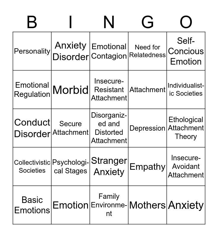 This bingo card has 25 words: Psychologi-cal Stages, Family Environme-nt, Insecure-Resistant Attachment, Basic Emotions, Self-Concious Emotion, Personality, Emotional Regulation, Anxiety Disorder, Depression, Stranger Anxiety, Attachment, Conduct Disorder, Empathy, Insecure-Avoidant Attachment, Morbid, Anxiety, Ethological Attachment Theory, Emotional Contagion, Individualist-ic Societies, Secure Attachment, Disorganiz-ed and Distorted Attachment, Emotion, Collectivistic Societies, Need for Relatedness and Mothers.