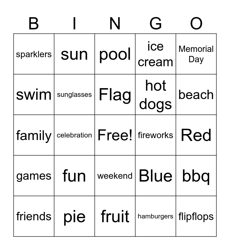 This bingo card has a free space and 28 words: bbq, popsicles, hot dogs, hamburgers, swim, pool, sun, games, fireworks, friends, family, ice cream, pie, fruit, beach, summer, fun, sunglasses, Flag, weekend, sparklers, sunscreen, flipflops, celebration, Red, Blue, Memorial Day and Cinco De Mayo.
