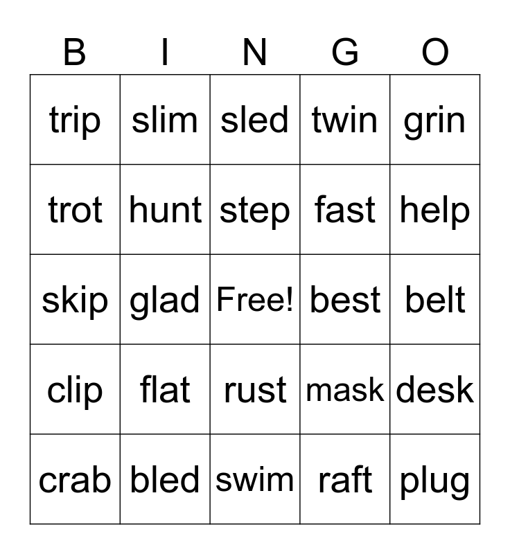 This bingo card has a free space and 24 words: flat, bled, step, crab, grin, trip, trot, slim, best, rust, fast, skip, mask, desk, hunt, raft, belt, sled, help, glad, plug, clip, twin and swim.