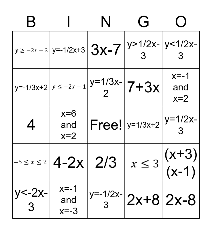 This bingo card has 13 images, a free space and 60 words: y=1/2x-3, y=1/2x+3, y=-1/2x+3, y=-1/2x-3, y=-1/3x+2, y=-1/3x-2, y=1/3x+2, y=1/3x-2, y>1/2x-3, y<1/2x-3, y>2x-3, y<-2x-3, (-3,0), (-4,1), (2,0), (-2,-4), x=1 and x=3, x=-1 and x=-3, (x+1)(x-3), (x+1)(x+3), x=-6 and x=2, x=6 and x=2, (x-6)(x+2), (x+6)(x-2), all real numbers, 2x-8, 8-2x, 2x+8, 4-2x, 2x-4, 4x-2, 7-3x, 7+3x, 3x-7, 3x-6, 6-3x, 4, -4, 2, -3, -2, -1, 1, 3/2, 2/3, -3/2, Positive, Negative, Zero, Undefined, x=-1 and x=2, x=1 and x=-2, (x-1)(x+2), x=-3 and x=1, (x-3)(x+1), (x+3)(x-1), y>1/4x+4, y<1/4x+4, y>-1/4x+4 and y>2x-1.
