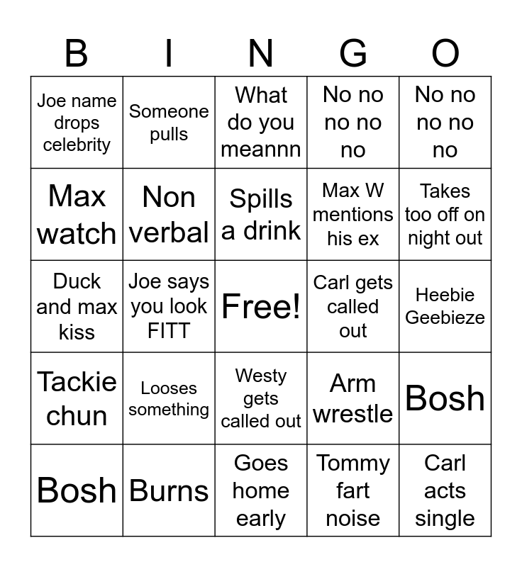 This bingo card has a free space and 24 words: Bosh, Looses something, Spills a drink, Tommy fart noise, No no no no no, Joe name drops celebrity, Someone pulls, What do you meannn, Carl gets called out, Heebie Geebieze, Duck and max kiss, Non verbal, Arm wrestle, Bosh, Max watch, Burns, Goes home early, No no no no no, Takes too off on night out, Tackie chun, Joe says you look FITT, Westy gets called out, Max W mentions his ex and Carl acts single.
