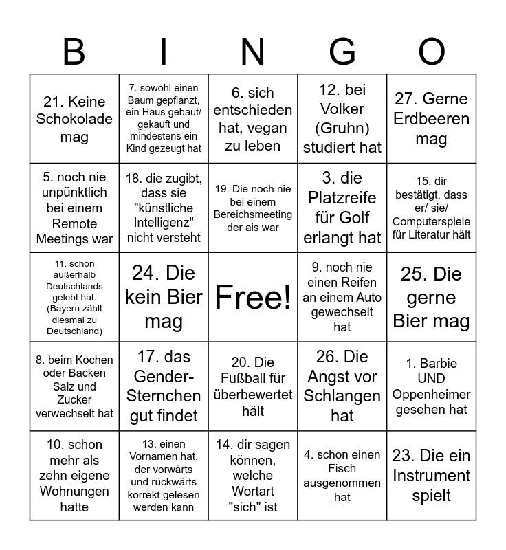 This bingo card has a free space and 28 words: 1. Barbie UND Oppenheimer gesehen hat, 2. alle Harry Potter_Bücher gelesen hat, 3. die Platzreife für Golf erlangt hat, 4. schon einen Fisch ausgenommen hat, 5. noch nie unpünktlich bei einem Remote Meetings war, 6. sich entschieden hat, vegan zu leben, 7. sowohl einen Baum gepflanzt, ein Haus gebaut/ gekauft und mindestens ein Kind gezeugt hat, 8. beim Kochen oder Backen Salz und Zucker verwechselt hat, 9. noch nie einen Reifen an einem Auto gewechselt hat, 10. schon mehr als zehn eigene Wohnungen hatte, 11. schon außerhalb Deutschlands gelebt hat. (Bayern zählt diesmal zu Deutschland), 12. bei Volker (Gruhn) studiert hat, 13. einen Vornamen hat, der vorwärts und rückwärts korrekt gelesen werden kann, 14. dir sagen können, welche Wortart "sich" ist, 15. dir bestätigt, dass er/ sie/ Computerspiele für Literatur hält, 16. dir sagen kann, was passiert, wenn man mit der Google-Suche nach "eclipse 2024" sucht, 17. das Gender-Sternchen gut findet, 18. die zugibt, dass sie "künstliche Intelligenz" nicht versteht, 19. Die noch nie bei einem Bereichsmeeting der ais war, 20. Die Fußball für überbewertet hält, 21. Keine Schokolade mag, 22. Im Juni Geburtstag hat, 23. Die ein Instrument spielt, 24. Die kein Bier mag, 25. Die gerne Bier mag, 26. Die Angst vor Schlangen hat, 27. Gerne Erdbeeren mag and 28. Gerne zeichnet.