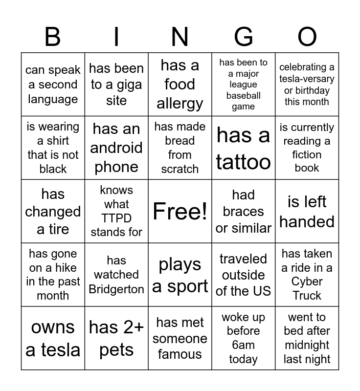This bingo card has a free space and 24 words: has watched Bridgerton, has 2+ pets, has made bread from scratch, owns a tesla, celebrating a tesla-versary or birthday this month, can speak a second language, is wearing a shirt that is not black, has been to a giga site, had braces or similar, plays a sport, has a tattoo, has changed a tire, traveled outside of the US, has taken a ride in a Cyber Truck, has an android phone, woke up before 6am today, is left handed, has a food allergy, is currently reading a fiction book, knows what TTPD stands for, went to bed after midnight last night, has gone on a hike in the past month, has been to a major league baseball game and has met someone famous.