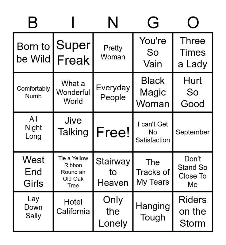 This bingo card has a free space and 99 words: Mustang Sally, You Light up my Life, Pour Some Sugar on Me, Pretty Woman, Under The Boardwalk, Vacation, Little Red Corvette, Let's Stay Together, Beat it, Bohemian Rhapsody, Free Bird, Bad,Bad, Leroy Brown, Pinball Wizard, Stairway to Heaven, Louie, Louie, Born to be Wild, Super Freak, Stayin' Alive, Whip It, You're the One That I Want, Bang a Gong, I Got You Babe, Black Betty, Sitting on the Dock of the Bay, Girls Just Want to Have Fun, Don't Stand So Close To Me, Everyday People, Like a Virgin, Kung fu Fighting, Queen of Hearts, Only the Lonely, Hanging Tough, Summer of '69, Unchained Melody, Jive Talking, All Night Long, I will Survive, Sugar, Sugar, She Blinded me with Science, Tie a Yellow Ribbon Round an Old Oak Tree, Do You Believe in Magic, Hurt So Good, You're So Vain, Hotel California, Light My Fire, Magic, Son of a Preacher Man, Summer in the City, Good Lovin', Shadow Dancing, Round and Round, Riders on the Storm, The Tracks of My Tears, Flashdance What a Feeling, Ring My Bell, Magic Carpet Ride, We Got the Beat, Get Back, Hey Jude, American Pie, Delta Dawn, Maggie May, My Prerogative, Dancing Queen, Mornin' Train, Three Times a Lady, Walk This Way, Blowin' in the Wind, Midnight Train to Georgia, West End Girls, The Lion Sleeps Tonight, Black Magic Woman, Comfortably Numb, Rock the Casbah, Hold Me, Sweet Dreams, What a Wonderful World, Turn, Turn, Turn, Brown Eyed Girl, Dance to the Music, I can't Get No Satisfaction, Cathy's Clown, Daydream Believer, Crimson & Clover, Knock Three Times, Under Pressure, Hot Child in the City, Blinded by the Light, September, Lay Down Sally, Another One Bites the Dust, Bridge Over Troubled Water, The Twist, My Sharona, Monday, Monday, Smoke on the Water, When Doves Cry, Material Girl and I Love Rock N' Roll.