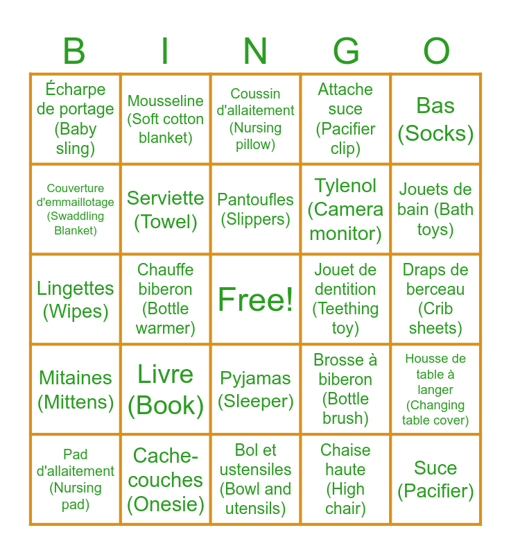 This bingo card has a free space and 41 words: Couches (Diappers), Lingettes (Wipes), Débarbouillette (Washcloth), Serviette (Towel), Cache-couches (Onesie), Pyjamas (Sleeper), Pantoufles (Slippers), Couverture (Blanket), Bas (Socks), Mitaines (Mittens), Chauffe biberon (Bottle warmer), Attache suce (Pacifier clip), Suce (Pacifier), Draps de berceau (Crib sheets), Jouet de dentition (Teething toy), Livre (Book), Thermomètre (Thermometer), Écharpe de portage (Baby sling), Tapis d'éveil (Playmat), Coussin d'allaitement (Nursing pillow), Housse de table à langer (Changing table cover), Bavoirs (Bibs), Bol et ustensiles (Bowl and utensils), Tylenol (Camera monitor), Moniteur caméra (Diaper bag), Sac à couches (Diaper bag), Chaise haute (High chair), Chaise berçante à bébé (Baby rocking chair), Jouets de bain (Bath toys), Peluche (Plush toy), Sac réutilisable humide/sec (Wet dry bag), Mousseline (Soft cotton blanket), Pad d'allaitement (Nursing pad), Protège carnet de santé (Health booklet cover), Brosse à biberon (Bottle brush), Couverture d'emmaillotage (Swaddling Blanket), Shampooing/savon (Shampoo/soap), Crème de corps (body cream), Crème de change (Diapper cream), Pare-soleil voiture (Car sun shade) and Biberon (Feeding bottle).