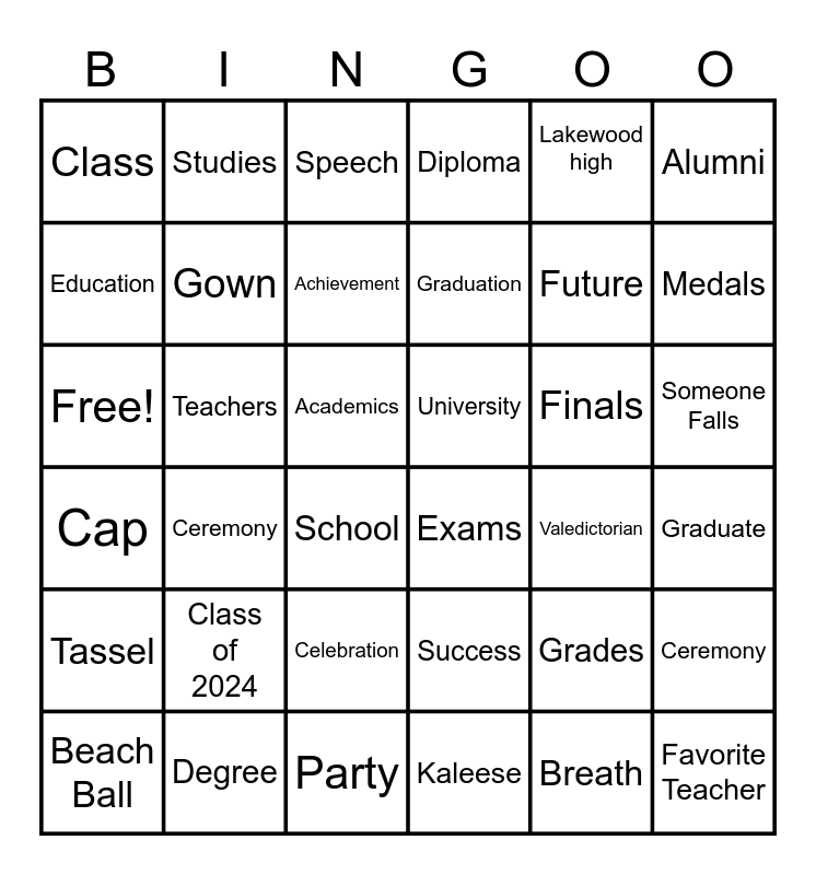 This bingo card has 36 words: Success, Celebration, Kaleese, Education, Cap, University, Gown, Party, Lakewood high, Grades, Medals, Diploma, Ceremony, Teachers, Graduation, Class, Tassel, Finals, Free!, Speech, Academics, Ceremony, Exams, School, Valedictorian, Studies, Future, Degree, Achievement, Alumni, Favorite Teacher, Beach Ball, Graduate, Someone Falls, Class of 2024 and Breath.