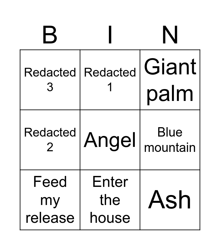 This bingo card has 9 words: Feed my release, Giant palm, Redacted 1, Redacted 2, Redacted 3, Blue mountain, Angel, Ash and Enter the house.