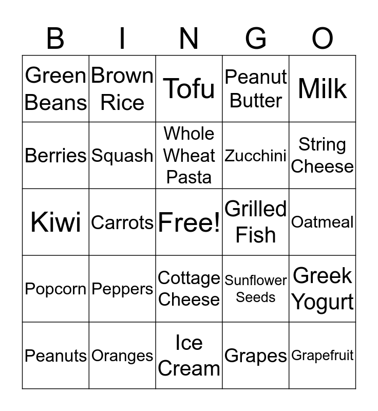 This bingo card has a free space and 24 words: Peppers, Oranges, Whole Wheat Pasta, Peanuts, Milk, Green Beans, Berries, Brown Rice, Grilled Fish, Cottage Cheese, Zucchini, Kiwi, Sunflower Seeds, Greek Yogurt, Squash, Grapes, Oatmeal, Tofu, String Cheese, Carrots, Grapefruit, Popcorn, Peanut Butter and Ice Cream.