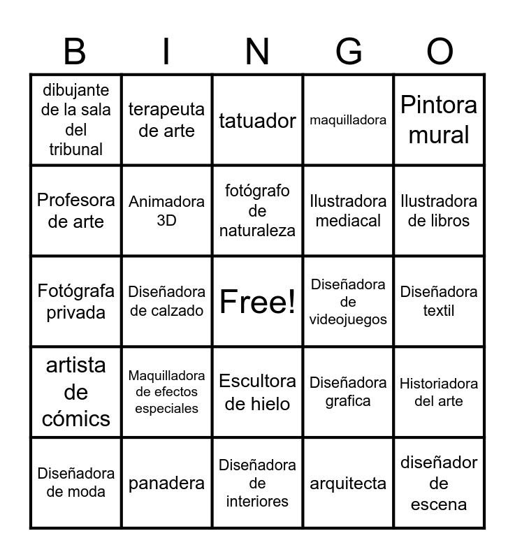 This bingo card has a free space and 24 words: Maquilladora de efectos especiales, panadera, fotógrafo de naturaleza, Diseñadora de moda, Pintora mural, dibujante de la sala del tribunal, Profesora de arte, terapeuta de arte, Diseñadora de videojuegos, Escultora de hielo, Ilustradora mediacal, Fotógrafa privada, Diseñadora grafica, Historiadora del arte, Animadora 3D, arquitecta, Diseñadora textil, tatuador, Ilustradora de libros, Diseñadora de calzado, diseñador de escena, artista de cómics, maquilladora and Diseñadora de interiores.