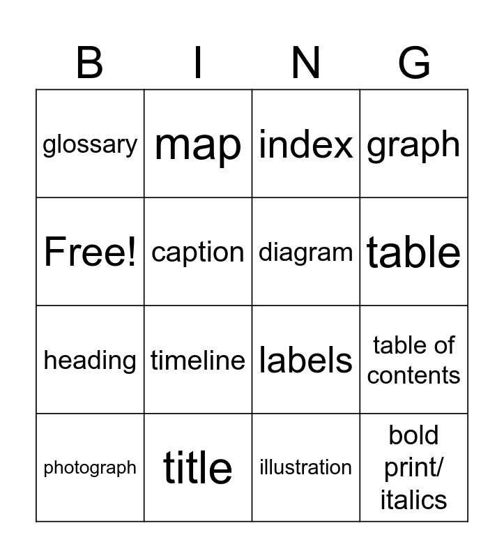 This bingo card has 16 words: title, table of contents, index, glossary, heading, map, labels, illustration, Free!, caption, photograph, graph, timeline, table, diagram and bold print/ italics.