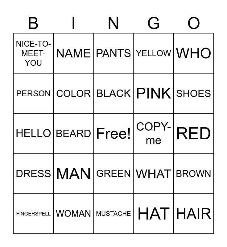 This bingo card has a free space and 24 words: MAN, WOMAN, BLACK, FINGERSPELL, WHO, NICE-TO-MEET-YOU, PERSON, NAME, COPY-me, GREEN, PINK, HELLO, WHAT, BROWN, COLOR, HAT, RED, PANTS, SHOES, BEARD, HAIR, DRESS, YELLOW and MUSTACHE.