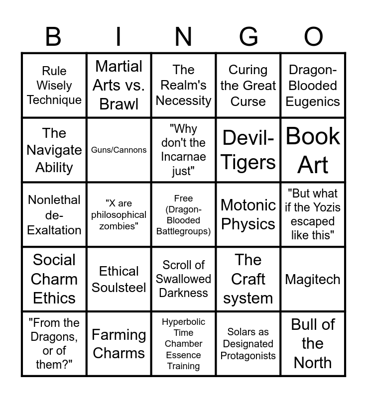 This bingo card has a free space and 24 words: Ethical Soulsteel, Farming Charms, "Why don't the Incarnae just", "From the Dragons, or of them?", Dragon-Blooded Eugenics, Rule Wisely Technique, The Navigate Ability, Martial Arts vs. Brawl, Motonic Physics, Scroll of Swallowed Darkness, Devil-Tigers, Nonlethal de-Exaltation, The Craft system, Magitech, Guns/Cannons, Solars as Designated Protagonists, "But what if the Yozis escaped like this", The Realm's Necessity, Book Art, "X are philosophical zombies", Bull of the North, Social Charm Ethics, Curing the Great Curse and Hyperbolic Time Chamber Essence Training.