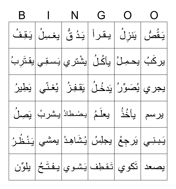 This bingo card has 36 words: يجلِسُ, ُيُـشَاهِـد, تَـقـطِف, ُيقـتَرِب, يَصِلُ, يَدخُـلُ, يَـسـقِـي, يَـشـوي, يَنزِلُ, يَرجِعُ, يركَبُ, يـقـرأ, يَـبـنِـي, يُغـنّي, يأكُـلُ, يَـقِـفُ, يَـنُـظُـرُ, ُيُصَوِّر, يَطِيرُ, يَـدُ قُّ, يَقـفِـزُ, يـشربُ, يعلَـمُ, ُيـصْـطاد, يأخُذُ, يغـسِلُ, ُيحـمِـل, يـفـتَـحُ, يشْتري, يَـقُصُّ, يصعد, يلوِّن, يرسم, يجري, يمشي and تَكوي.