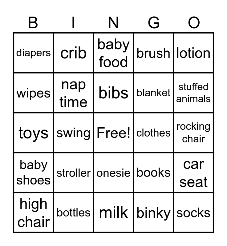 This bingo card has a free space and 24 words: stroller, bottles, bibs, high chair, lotion, diapers, wipes, crib, clothes, onesie, blanket, toys, books, car seat, nap time, binky, rocking chair, baby food, stuffed animals, swing, socks, baby shoes, brush and milk.