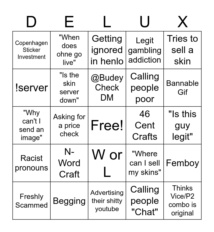 This bingo card has a free space and 24 words: N-Word Craft, Begging, @Budey Check DM, Freshly Scammed, Tries to sell a skin, Copenhagen Sticker Investment, !server, "When does ohne go live", 46 Cent Crafts, W or L, Calling people poor, "Why can't I send an image", "Where can I sell my skins", Femboy, "Is the skin server down", Calling people "Chat", "Is this guy legit", Getting ignored in henlo, Bannable Gif, Asking for a price check, Thinks Vice/P2 combo is original, Racist pronouns, Legit gambling addiction and Advertising their shitty youtube.
