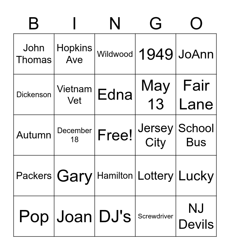 This bingo card has a free space and 24 words: Gary, Joan, Edna, Pop, JoAnn, John Thomas, Dickenson, Hopkins Ave, Jersey City, Hamilton, May 13, Autumn, Lottery, Lucky, Vietnam Vet, Screwdriver, School Bus, Wildwood, Fair Lane, December 18, NJ Devils, Packers, 1949 and DJ's.
