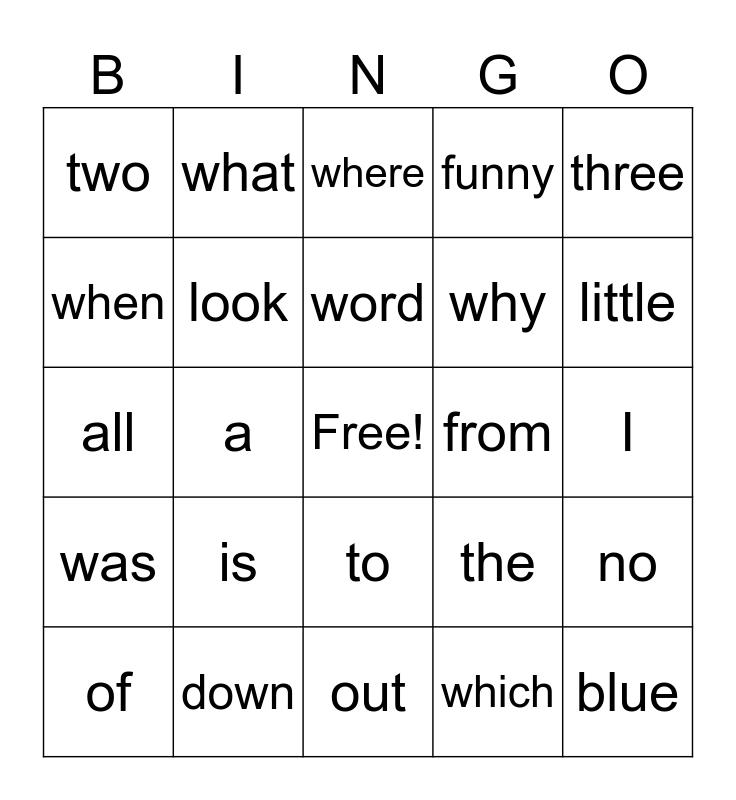 This bingo card has a free space and 28 words: no, so, why, which, when, where, what, was, from, of, all, funny, down, out, little, are, is, look, word, to, two, yellow, blue, a, I, the, three and one.