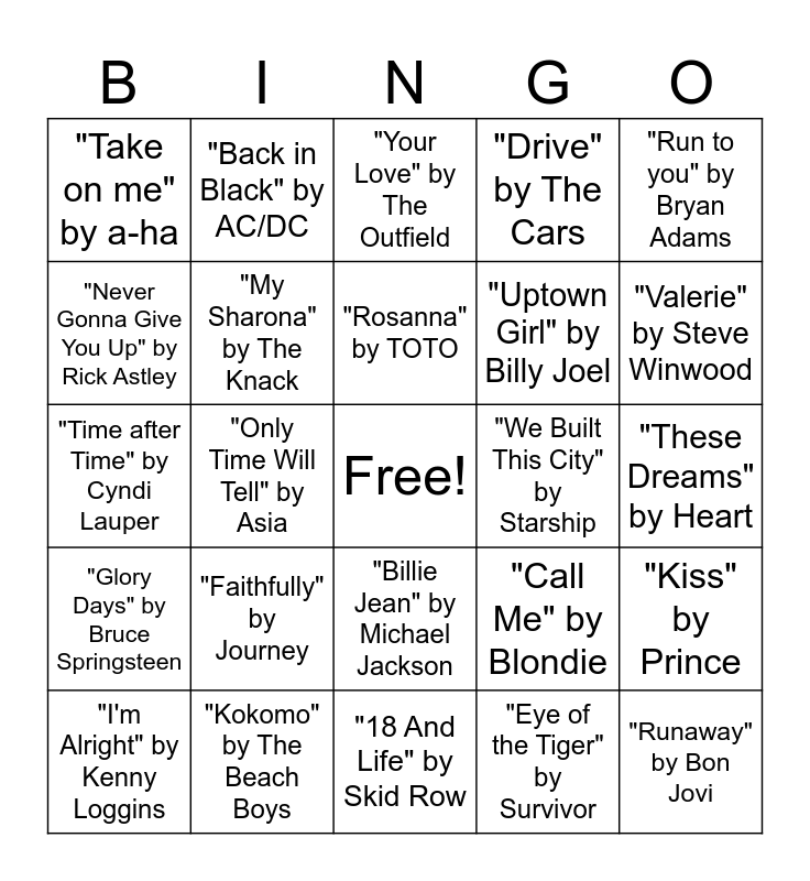 This bingo card has a free space and 24 words: "Faithfully" by Journey, "Kokomo" by The Beach Boys, "Rosanna" by TOTO, "I'm Alright" by Kenny Loggins, "Run to you" by Bryan Adams, "Take on me" by a-ha, "Never Gonna Give You Up" by Rick Astley, "Back in Black" by AC/DC, "We Built This City" by Starship, "Billie Jean" by Michael Jackson, "Uptown Girl" by Billy Joel, "Time after Time" by Cyndi Lauper, "Call Me" by Blondie, "Kiss" by Prince, "My Sharona" by The Knack, "Eye of the Tiger" by Survivor, "These Dreams" by Heart, "Your Love" by The Outfield, "Valerie" by Steve Winwood, "Only Time Will Tell" by Asia, "Runaway" by Bon Jovi, "Glory Days" by Bruce Springsteen, "Drive" by The Cars and "18 And Life" by Skid Row.