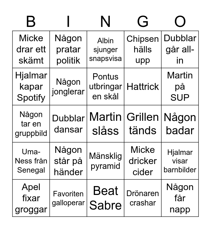 This bingo card has a free space and 24 words: Någon står på händer, Favoriten galloperar, Pontus utbringar en skål, Apel fixar groggar, Dubblar går all-in, Micke drar ett skämt, Hjalmar kapar Spotify, Någon pratar politik, Grillen tänds, Mänsklig pyramid, Hattrick, Någon tar en gruppbild, Micke dricker cider, Hjalmar visar barnbilder, Någon jonglerar, Drönaren crashar, Någon badar, Albin sjunger snapsvisa, Martin på SUP, Dubblar dansar, Någon får napp, Uma-Ness från Senegal, Chipsen hälls upp and Beat Sabre.