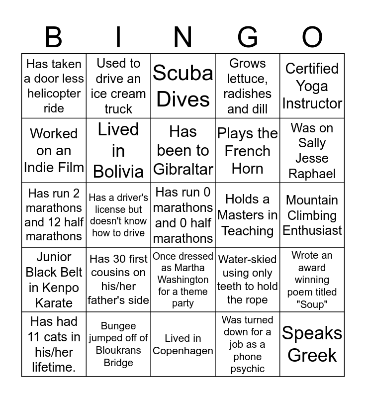 This bingo card has a free space and 24 words: Has 30 first cousins on his/her father's side, Bungee jumped off of Bloukrans Bridge, Has been to Gibraltar, Has had 11 cats in his/her lifetime., Certified Yoga Instructor, Has taken a door less helicopter ride, Worked on an Indie Film, Used to drive an ice cream truck, Holds a Masters in Teaching, Once dressed as Martha Washington for a theme party, Plays the French Horn, Has run 2 marathons and 12 half marathons, Water-skied using only teeth to hold the rope, Wrote an award winning poem titled "Soup", Lived in Bolivia, Was turned down for a job as a phone psychic, Mountain Climbing Enthusiast, Scuba Dives, Was on Sally Jesse Raphael, Has a driver's license but doesn't know how to drive, Speaks Greek, Junior Black Belt in Kenpo Karate, Grows lettuce, radishes and dill and Lived in Copenhagen.