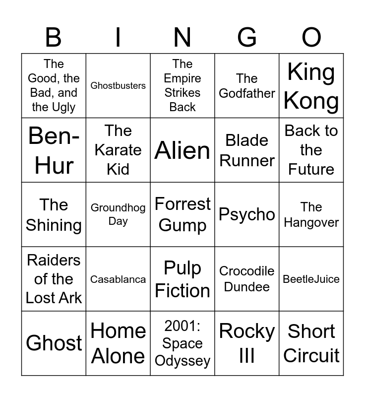 This bingo card has 30 words: Home Alone, Jurassic Park, Groundhog Day, The Terminator, The Good, the Bad, and the Ugly, The Empire Strikes Back, The Karate Kid, Pulp Fiction, Psycho, 2001: Space Odyssey, The Hangover, Forrest Gump, Rocky III, Short Circuit, Back to the Future, Interstellar, Crocodile Dundee, Raiders of the Lost Ark, Casablanca, King Kong, The Shining, Avatar, Ghostbusters, Blade Runner, Ben-Hur, The Godfather, BeetleJuice, Ghost, Alien and ET The Extra Terrestrial.