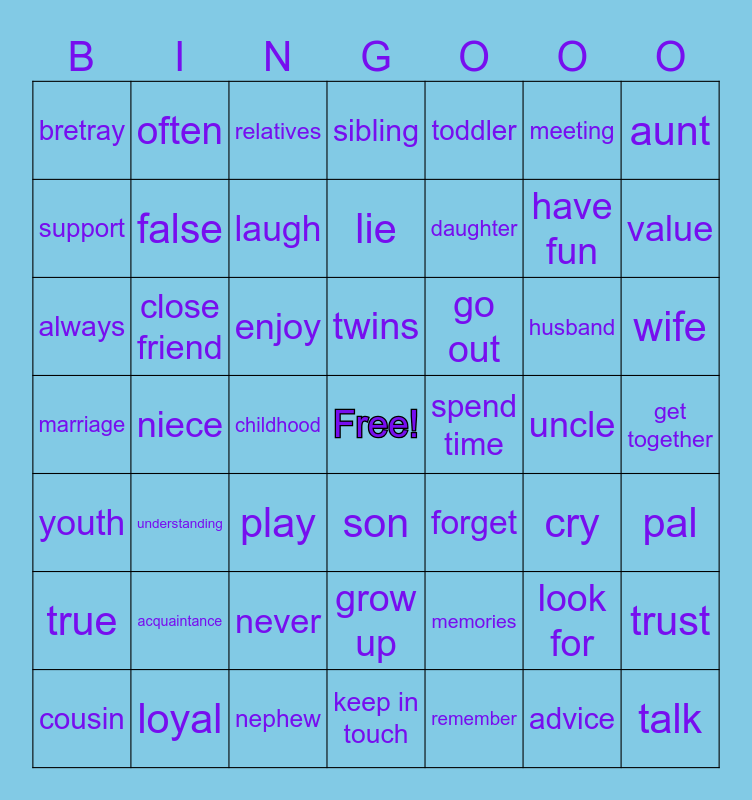 This bingo card has a free space and 48 words: youth, niece, nephew, son, daughter, uncle, aunt, cousin, close friend, childhood, sibling, toddler, husband, wife, marriage, acquaintance, relatives, twins, memories, meeting, value, support, often, laugh, remember, have fun, get together, true, understanding, enjoy, grow up, go out, look for, trust, bretray, loyal, play, keep in touch, spend time, advice, pal, always, false, never, lie, forget, cry and talk.