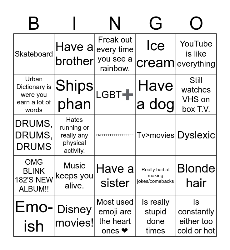 This bingo card has a free space and 24 words: Music keeps you alive., Disney movies!, LGBT➕, Emo-ish, YouTube is like everything, Skateboard, Urban Dictionary is were you earn a lot of words, Have a brother, Tv>movies, Have a sister, Have a dog, DRUMS, DRUMS, DRUMS, Really bad at making jokes/comebacks, Blonde hair, Ships phan, Is really stupid done times, Dyslexic, Freak out every time you see a rainbow., Still watches VHS on box T.V., Hates running or really any physical activity., Is constantly either too cold or hot, OMG BLINK 182'S NEW ALBUM!!, Ice cream and Most used emoji are the heart ones ❤.