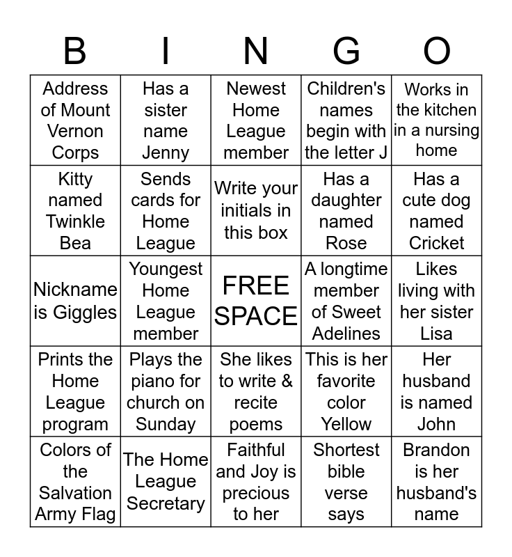 This bingo card has a free space and 24 words: Plays the piano for church on Sunday, The Home League Secretary, Write your initials in this box, Colors of the Salvation Army Flag, Works in the kitchen in a nursing home, Address of Mount Vernon Corps, Kitty named Twinkle Bea, Has a sister name Jenny, A longtime member of Sweet Adelines, She likes to write & recite poems, Has a daughter named Rose, Nickname is Giggles, This is her favorite color Yellow, Her husband is named John, Sends cards for Home League, Shortest bible verse says, Likes living with her sister Lisa, Newest Home League member, Has a cute dog named Cricket, Youngest Home League member, Brandon is her husband's name, Prints the Home League program, Children's names begin with the letter J and Faithful and Joy is precious to her.