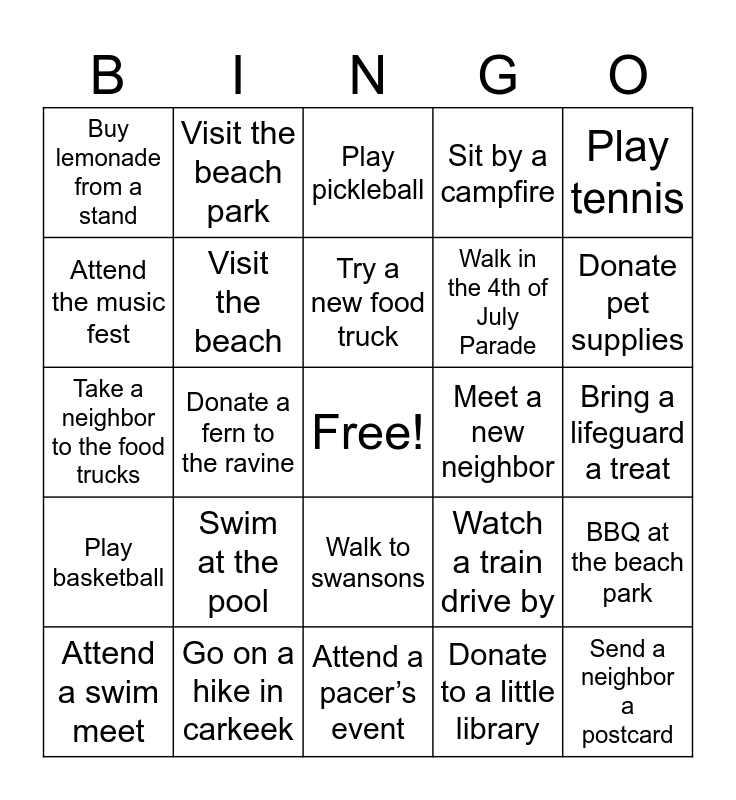 This bingo card has a free space and 24 words: Swim at the pool, Go on a hike in carkeek, Try a new food truck, Attend a swim meet, Play tennis, Buy lemonade from a stand, Attend the music fest, Visit the beach park, Meet a new neighbor, Walk to swansons, Walk in the 4th of July Parade, Take a neighbor to the food trucks, Watch a train drive by, BBQ at the beach park, Visit the beach, Donate to a little library, Bring a lifeguard a treat, Play pickleball, Donate pet supplies, Donate a fern to the ravine, Send a neighbor a postcard, Play basketball, Sit by a campfire and Attend a pacer’s event.