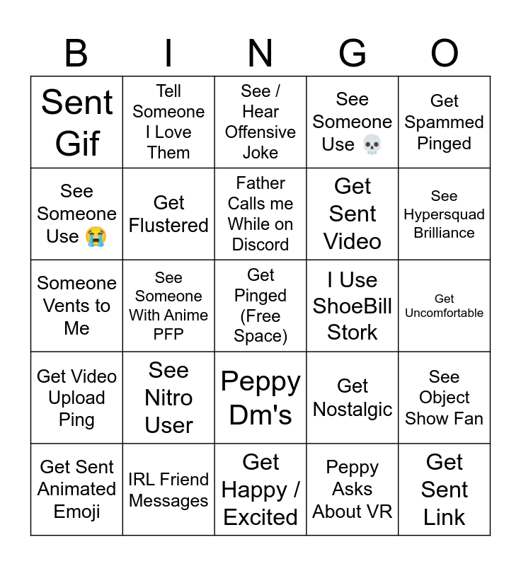 This bingo card has a free space and 54 words: Get Pinged From Server (Night), Get Video Upload Ping, See Cringe, Eii Dm's, Peppy Dm's, Get Annoyed, See Someone Use 💀, Get Ringed, See Someone Use ðŸ˜, Get Mad, Sent Gif, Discord Lags / Disconnects, IRL Friend Messages, Get Sent Animated Emoji, Get Replied to, Get Happy / Excited, Get Sent Link, Get Sent Video, Someone Asks to Play, Get Uncomfortable, Get Nostalgic, I Say Something Dumb, I Use ShoeBill Stork, Get Spammed Pinged, Get Sad, Tell Someone I Love Them, Get Pinged During Real Life Event, Get Called Aaron, Getting Teased, Peppy Asks About VR, Get Sent Meme, See Fellow Christian, Get Late Response, Be Ghosted, See / Hear Offensive Joke, I / Someone Laughs at Something Unfunny, Someone Vents to Me, See Object Show Fan, See Art, Get Flustered, Get Pinged by VR Content, Someone is a Jerk to me, Someone Complains About Something Little, Find Something Funny, See Nitro User, See Non-Hypersquad Member, Text While Eating, Dog Makes a Mess While on Discord, Father Calls me While on Discord, See Someone With Anime PFP, See Hypersquad Brilliance, See Hypersquad Bravery, See Hypersquad Balance and Someone Has Same Interests as me.