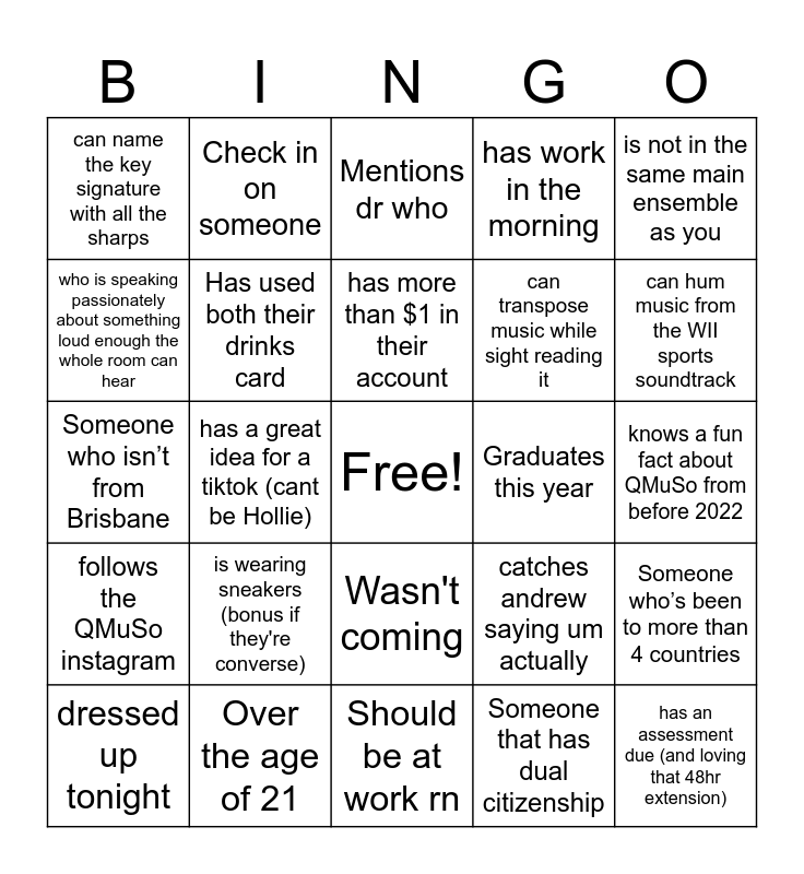 This bingo card has a free space and 39 words: Has Listened to Billie Eilish's new Album, can recommend 2 good brisbane bands/artists, loves Rics Bar, Has used both their drinks card, dressed up tonight, Wasn't coming, has more than $1 in their account, find someone from the winning team of sports day, is not in the same main ensemble as you, follows the QMuSo instagram, has a great idea for a tiktok (cant be Hollie), has work in the morning, has an assessment due (and loving that 48hr extension), knows a fun fact about QMuSo from before 2022, Graduates this year, is wearing sneakers (bonus if they're converse), likes the colour orange, can name the key signature with all the sharps, is not a drama major, catches andrew saying um actually, who is speaking passionately about something loud enough the whole room can hear, Should be at work rn, can transpose music while sight reading it, can hum music from the WII sports soundtrack, had a loose change meal from maccas this week, has their partner as their lock screen, High five the next person you see without saying anything, interrupts someone speaking, Create a secret handshake with someone, Check in on someone, Take a selfie with 2 people, has an opinion on Bridgerton season 3, Mentions dr who, Over the age of 21, Someone that has dual citizenship, Someone who didn’t iron thier shirt, Someone who’s been to more than 4 countries, Someone who isn’t from Brisbane and Doesn’t or no longer studies at qut.