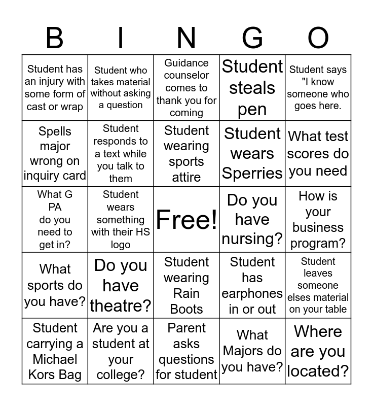 This bingo card has a free space and 24 words: Do you have theatre?, Are you a student at your college?, Student wearing sports attire, Student carrying a Michael Kors Bag, Student says "I know someone who goes here., Student has an injury with some form of cast or wrap, Spells major wrong on inquiry card, Student who takes material without asking a question, Do you have nursing?, Student wearing Rain Boots, Student wears Sperries, What GPA do you need to get in?, Student has earphones in or out, Student leaves someone elses material on your table, Student responds to a text while you talk to them, What Majors do you have?, How is your business program?, Guidance counselor comes to thank you for coming, What test scores do you need, Student wears something with their HS logo, Where are you located?, What sports do you have?, Student steals pen and Parent asks questions for student.