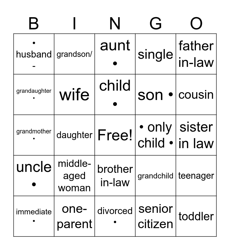 This bingo card has a free space and 42 words: baby •, child •, middle-aged man, middle-aged woman, senior citizen, teenager, toddler, young adult, aunt •, brother in-law, sister in law, cousin, daughter, father in-law, mother in law -, grandchild, grandfather, grandmother •, grandparent •, grandson/, grandaughter •, great-grandfather, great-grand mother, • husband -, nephew •, niece •, son •, son-in-law, daughter-in-law, stepfather, stepmother •, uncle •, wife, divorced •, extended •, immediate •, one-parent, • only child •, partner •, relative -, single and - twin (n.).