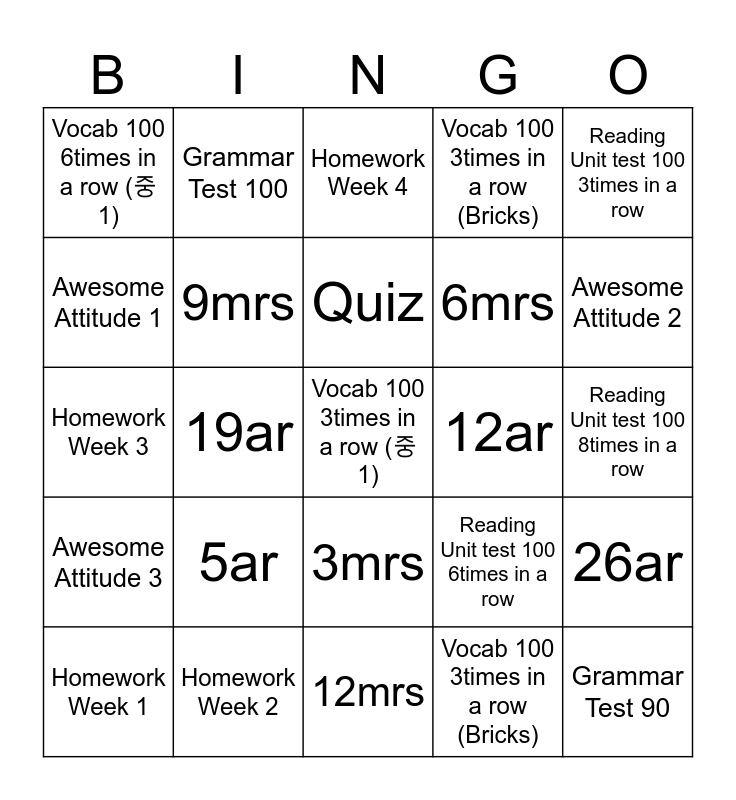 This bingo card has a free space and 24 words: 5ar, Homework Week 2, Quiz, Homework Week 1, Reading Unit test 100 3times in a row, Vocab 100 6times in a row (중1), Awesome Attitude 1, Grammar Test 100, 12ar, 3mrs, 6mrs, Homework Week 3, Reading Unit test 100 6times in a row, 26ar, 9mrs, Vocab 100 3times in a row (Bricks), Reading Unit test 100 8times in a row, Homework Week 4, Awesome Attitude 2, 19ar, Grammar Test 90, Awesome Attitude 3, Vocab 100 3times in a row (Bricks) and 12mrs.
