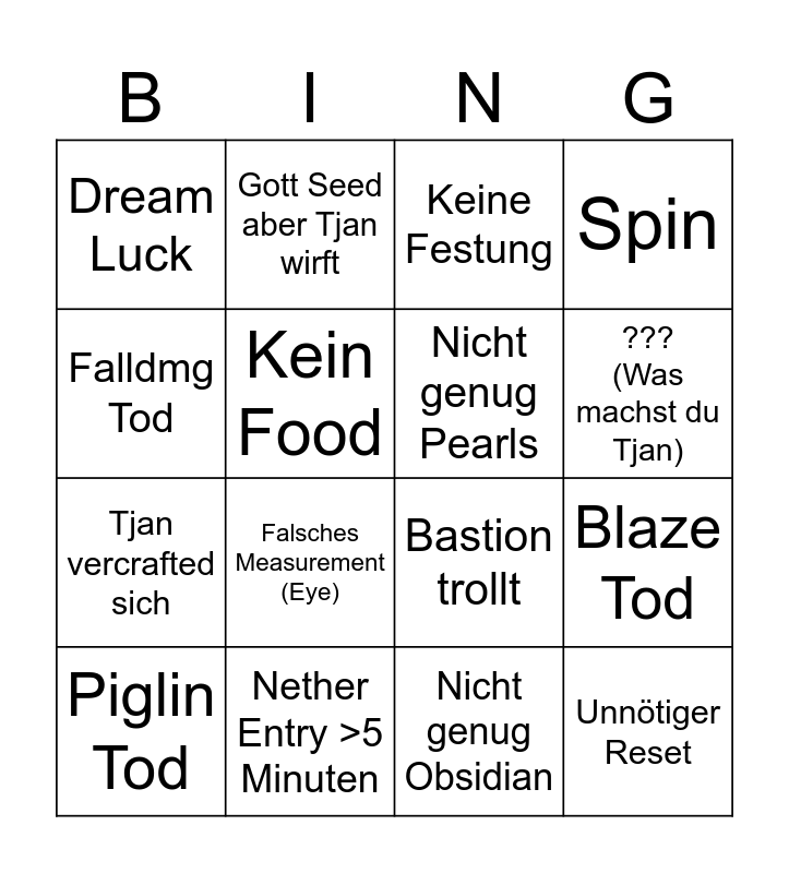 This bingo card has 16 words: Nether Entry >5 Minuten, Blaze Tod, Keine Festung, Dream Luck, Tjan vercrafted sich, Gott Seed aber Tjan wirft, Bastion trollt, Nicht genug Obsidian, Falldmg Tod, Kein Food, Piglin Tod, Spin, Falsches Measurement (Eye), ??? (Was machst du Tjan), Nicht genug Pearls and Unnötiger Reset.