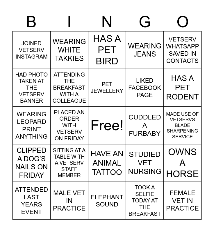 This bingo card has a free space and 25 words: SITTING AT A TABLE WITH A VETSERV STAFF MEMBER, ELEPHANT SOUND, PET JEWELLERY, ATTENDED LAST YEARS EVENT, VETSERV WHATSAPP SAVED IN CONTACTS, JOINED VETSERV INSTAGRAM, HAD PHOTO TAKEN AT THE VETSERV BANNER, WEARING WHITE TAKKIES, CUDDLED A FURBABY, HAVE AN ANIMAL TATTOO, LIKED FACEBOOK PAGE, WEARING LEOPARD PRINT ANYTHING, STUDIED VET NURSING, OWNS A HORSE, ATTENDING THE BREAKFAST WITH A COLLEAGUE, VISITED THE VETSERV CPT OFFICE, MADE USE OF VETSERVS BLADE SHARPENING SERVICE, HAS A PET BIRD, HAS A PET RODENT, PLACED AN ORDER WITH VETSERV ON FRIDAY, FEMALE VET IN PRACTICE, MALE VET IN PRACTICE, CLIPPED A DOG’S NAILS ON FRIDAY, WEARING JEANS and TOOK A SELFIE TODAY AT THE BREAKFAST.