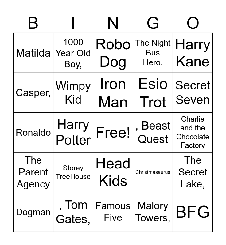 This bingo card has a free space and 29 words: Dogman, Space Boy, Harry Potter, Percy Jackson, Matilda, Robo Dog, Wimpy Kid, Storey TreeHouse, , Beast Quest, , Tom Gates,, Charlie and the Chocolate Factory, BFG, Famous Five, Malory Towers,, Secret Seven, The Explorer, Head Kids, The Parent Agency, Harry Kane, Ronaldo, Christmasaurus, Awful Aunty, Esio Trot, Casper,, The Night Bus Hero,, 1000 Year Old Boy,, The Secret Lake,, Iron Man and The Firework Maker's Daughter..