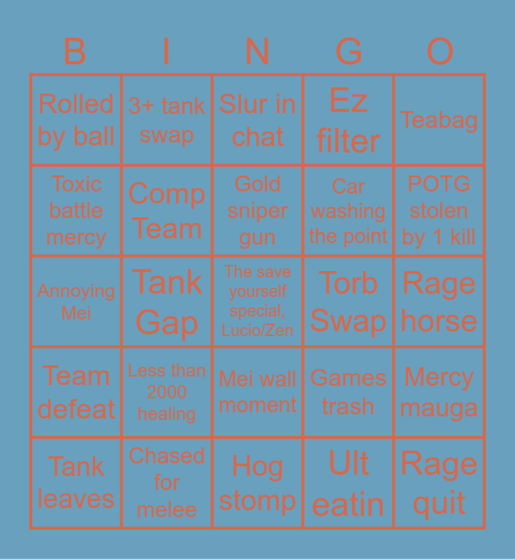 This bingo card has 93 words: Last minute lucio, Healer gap, Hog stomp, Antarctic peninsula, Last minute tracer, Widow insta lock, Salty person gets potg, Tank leaves, Twitch link, Complaining about supports, Leaves in setup, Sniper meta 4+ sniper team, Mauga bastion duo, Car washing the point, Kys, Teabag, Slur in chat, Targeting, Annoying life weaver, Completely wholesome game, Diff, Horse, 3 ults at once, Undeserved potg, Less than 2000 healing, Comp Team, STOP message in chat, Rage quit, Angy Chat, “Your mom”, Chased for melee, Mei wall moment, Porcshiper, Edaters, 3+ tank swap, Spawn camp, Rage switch mauga, Hacker, Gold sniper gun, Games trash, Annoying Mei, Team defeat, Rage horse, Constant res the annoying player, The save yourself special, Lucio/Zen, OWO, 2+ angry people, Recurring characters, I need healing doesn't need healing, Torb turret kills 4 people, Swap into gold weapon, Ult eatin, Kills a friendly, mommy/daddy names, Constantly ulting, Creative insult, Angry over rez, Mech squish, Mauga, Mauga dies in ult, Tank Gap, Unfair defeat, Slur in username, Tank less than 1000 mitigation if possible, Bad player good with ults, Solo ult, Ball with zero deaths, Echo phrah, Toxic battle mercy, Mercy Fleshlight, Farming environmentals, Mystery heroes, Ez in chat, Ez filter, 20+ deaths, Not getting on point, POTG stolen by 1 kill, Mercy mauga, Complaining about dps, Kill before mech, Pharmercy, Stun Jail, Torb Swap, Rolled by ball, Bastion stomp, Turret team, Angry mauga swap, Sombra support targeting, Two mad strat no kills, Last minute bastion switch, Less than 1000 dmg, I need healing (isn't near the team and Riptire destroy.