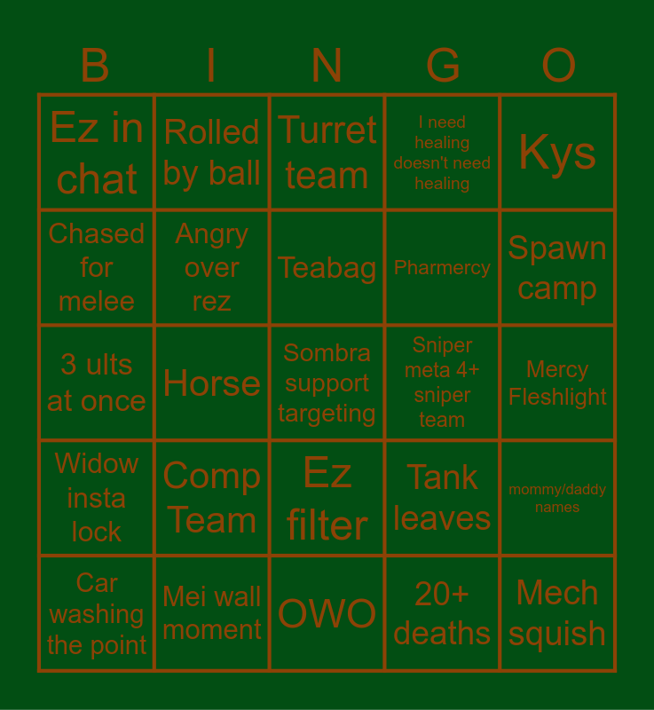 This bingo card has 93 words: Complaining about dps, Undeserved potg, OWO, Unfair defeat, Two mad strat no kills, Angy Chat, Team defeat, Car washing the point, Diff, Riptire destroy, Gold sniper gun, Echo phrah, 3+ tank swap, Pharmercy, The save yourself special, Lucio/Zen, Kys, Turret team, Last minute lucio, I need healing (isn't near the team, Last minute bastion switch, Swap into gold weapon, “Your mom”, Rage horse, Constant res the annoying player, Comp Team, Angry over rez, Hog stomp, Mech squish, Ball with zero deaths, Porcshiper, Mei wall moment, Ez filter, Stun Jail, Annoying life weaver, Rolled by ball, Healer gap, Complaining about supports, Targeting, Teabag, Tank leaves, 3 ults at once, Widow insta lock, Mercy Fleshlight, Mercy mauga, Sombra support targeting, Mauga bastion duo, Constantly ulting, Kills a friendly, Toxic battle mercy, Salty person gets potg, Leaves in setup, 20+ deaths, Creative insult, Mauga dies in ult, Hacker, Slur in chat, Not getting on point, Rage quit, Tank less than 1000 mitigation if possible, Twitch link, Horse, Games trash, Antarctic peninsula, Farming environmentals, Torb turret kills 4 people, Mystery heroes, STOP message in chat, Less than 1000 dmg, Chased for melee, Rage switch mauga, Ult eatin, Edaters, Completely wholesome game, I need healing doesn't need healing, 2+ angry people, Less than 2000 healing, Spawn camp, mommy/daddy names, POTG stolen by 1 kill, Bad player good with ults, Slur in username, Tank Gap, Sniper meta 4+ sniper team, Ez in chat, Bastion stomp, Mauga, Last minute tracer, Angry mauga swap, Kill before mech, Recurring characters, Torb Swap, Solo ult and Annoying Mei.